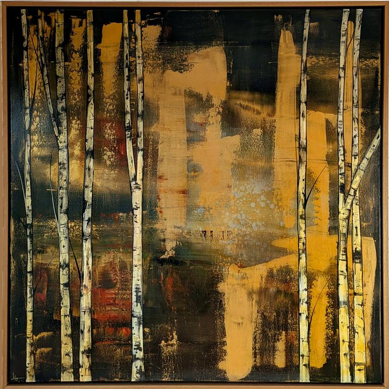 Acrylic, Ink, Pen, Varnish on Canvas. Beautiful Silver Birch trees, set over a semi-abstract acrylic background, reminiscent of first or last light glowing in gold through the trees. Featuring intricate, flowing details in pen, this canvas is also a celebration of natural beauty, glimpses of light,...