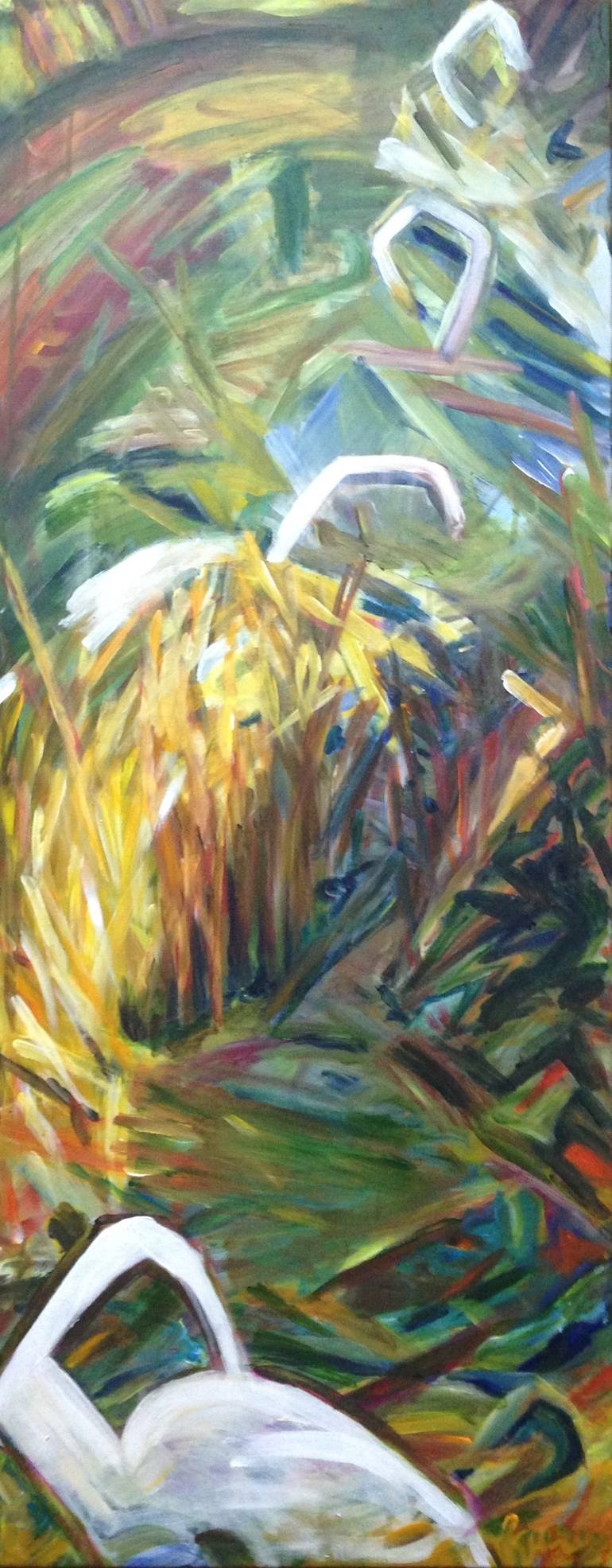 By a coastal lake, watching swans, coots, egrets and some unfamiliar and mysterious diving birds. Listening to the sound of the wind whooshing in the reeds. The lake water was lively (I wrote in my sketchbook "hurrying water") mirroring the activity of the waterbirds. Sunlight. The brushstrokes ...