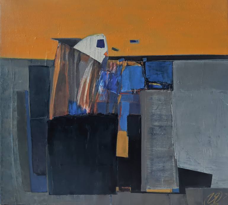 This artwork is an emotional painting where the artist is looking for balance. It is an abstract painting that gives the spectator a special opportunity to imagine this flying bird. You can feel the moment between the ground and the sky. Blue, grey and red ochre with a bit of orange fill the surface...