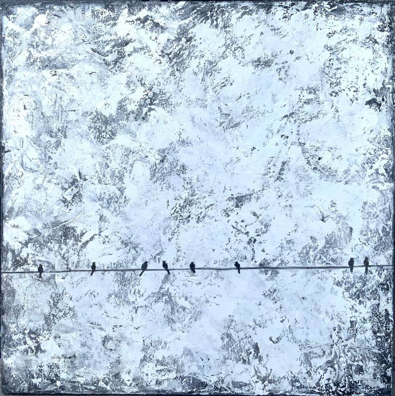 This contemporary black and white painting, "Birds Sitting on a Wire," captures a peaceful moment in nature. The acrylic on canvas artwork emphasizes texture, adding depth and visual interest. The neutral tones create a serene and calming effect, perfect for bringing a sense of tranquility to your l...