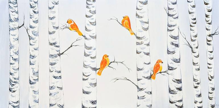 Original abstract painting, Acrylic on Canvas, created in my studio. Professional Grade Acrylic Paint, Acrylic on Stretched Canvas. This piece arrives ready to hang as-is, or is suitable for framing as well. Title: Birds in Aspen Trees Size: 50x100 cm (20"x40") SIGNATURE: Always signed. Either on t...
