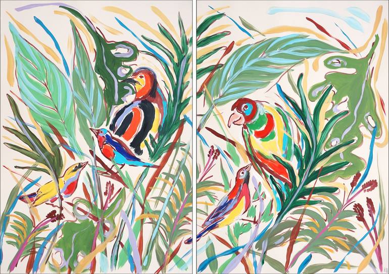 This stunning diptych by Romina Milano captures the vibrant essence of tropical fauna, showcasing lush greenery intertwined with colorful parrots. Each panel freely travels from the vivid plumage of the parrots to the textured foliage, creating a lively and harmonious scene. Perfect for nature enthu...