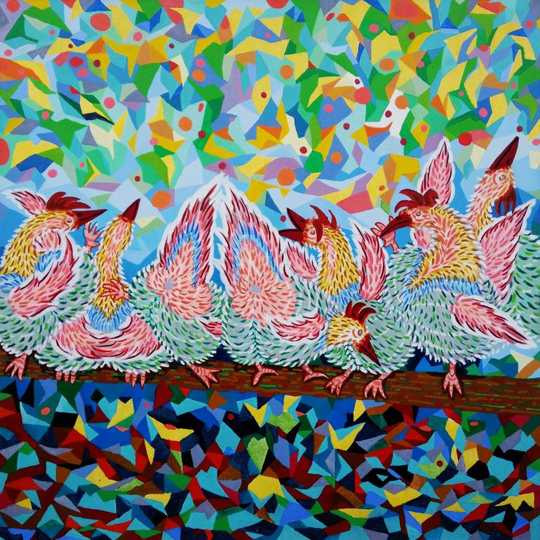 Colony of beautiful birds sitting on wood in trees and resting after lunch. Some are sleeping, some dont feel comfortable and some still need something like more food or something.