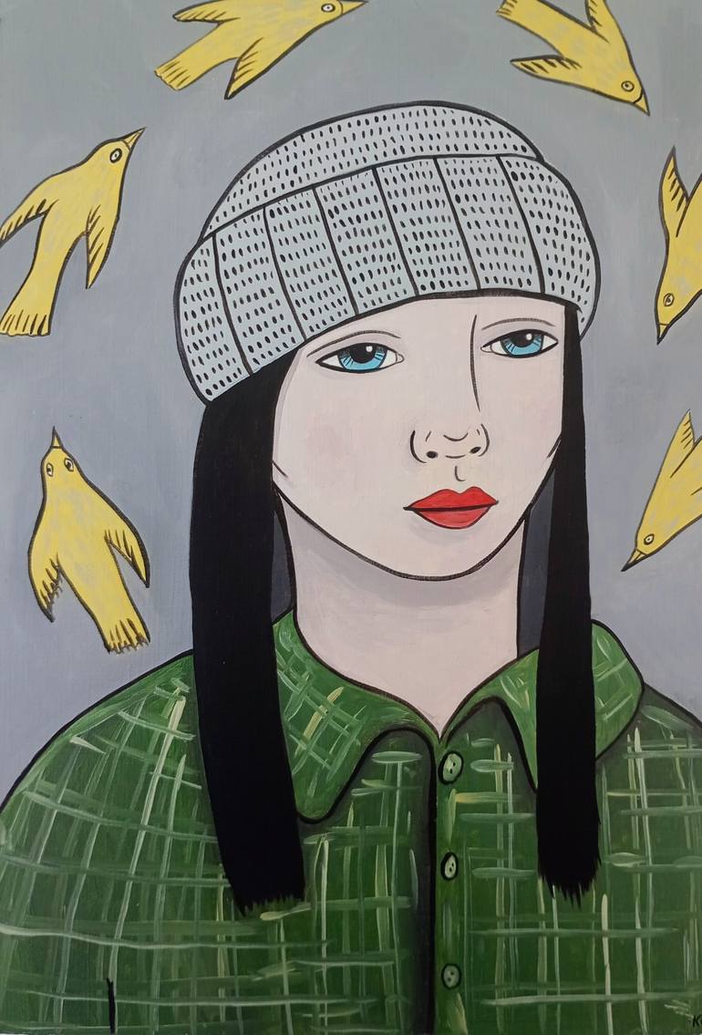 Original portrait painting in oil on paper, a surreal illustrative portrait.