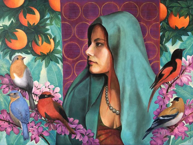 The relationship that is established between classical and modern, between the tradition of Renaissance painting and contemporary trends. A fantasy that brings together a girl, birds, oranges in the orange tree, and the branches of a flowering tree. The challenge is: how do they all come together, a...