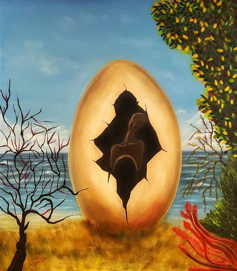 In this painting, I channel the essence of beginning and the profound metamorphosis of life. The egg symbolizes potential, enveloping the silhouetted figure that emerges, representing birth and new beginnings. Set against a backdrop that balances desolation and vibrancy, this work explores the etern...