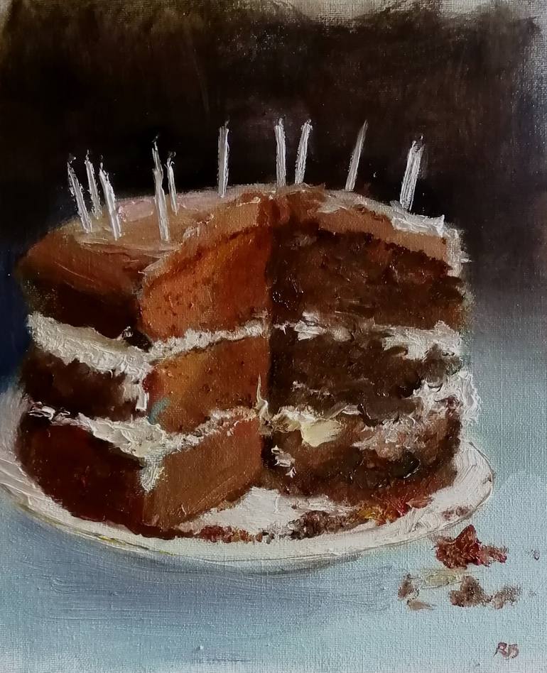 A still life oil painting of a chocolate cake - both baked and painted by the artist.
