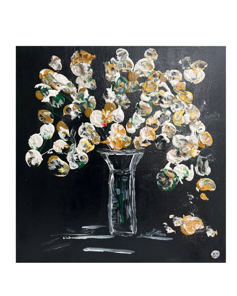 Black Beauty is a striking acrylic painting created on a bold black canvas, setting the stage for its dramatic composition. A vase of flowers emerges, painted with white, gold, black, and green hues. The piece exudes sophistication, using a minimal palette to craft a deeply emotional and visually im...