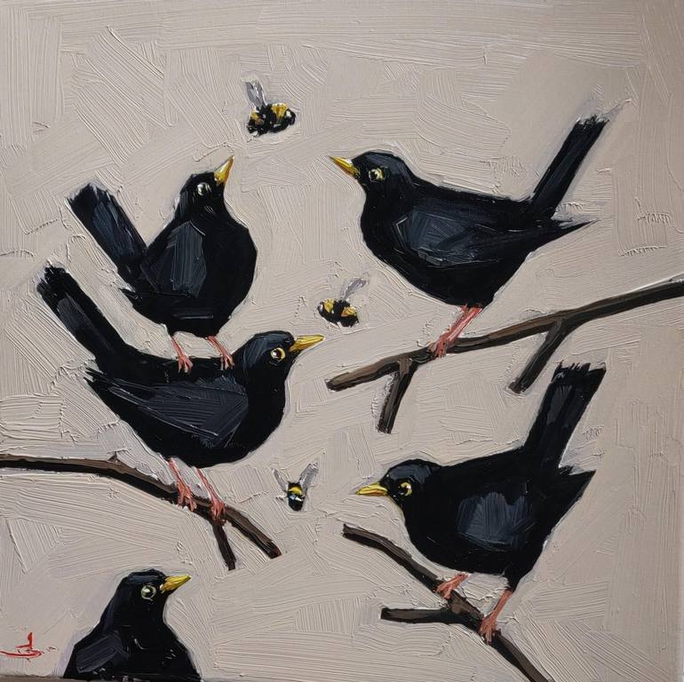 A whimsical oil painting of black birds and bumble bees . A heavily textured painting that would look great adorning the interior of any wall space. Frame and Hang.