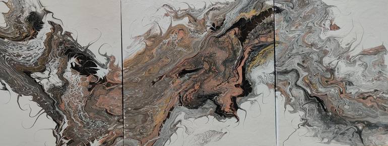 I decided to do something different yet somewhat similar in the creation of this piece. It's not easy to do 3 panels simultaneously. It took me awhile to make it work. The end result is lively, chaotic, whimsical and fun. Even with the neutral color palette that I chose, I love it!