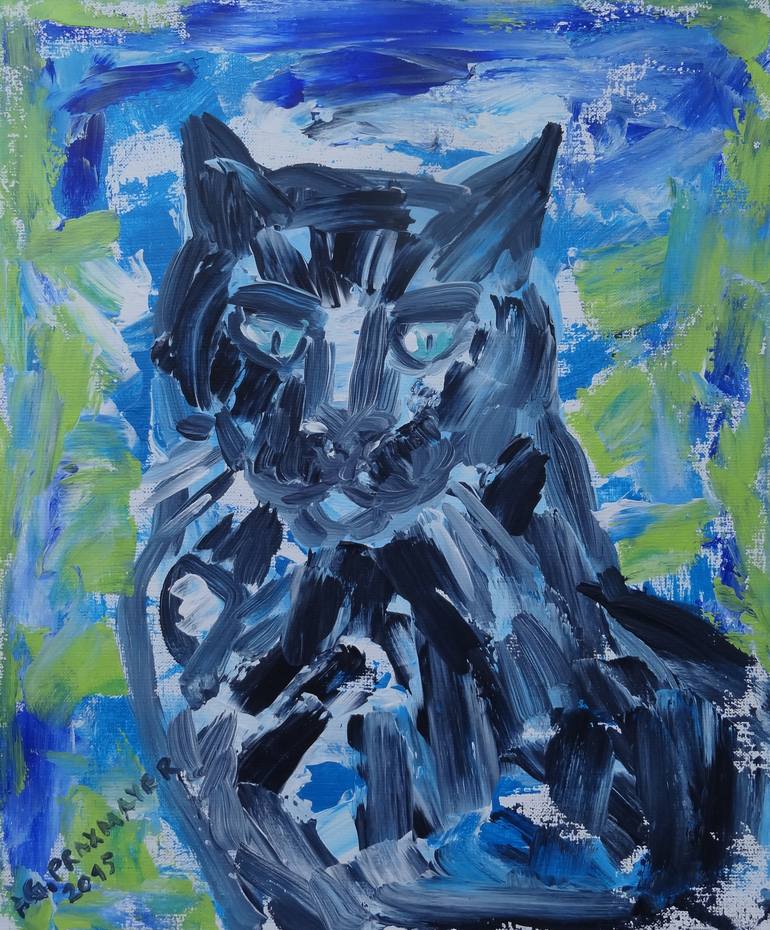 Black cat was sitting in the window and watching... Realized in acrylic on linen canvas.