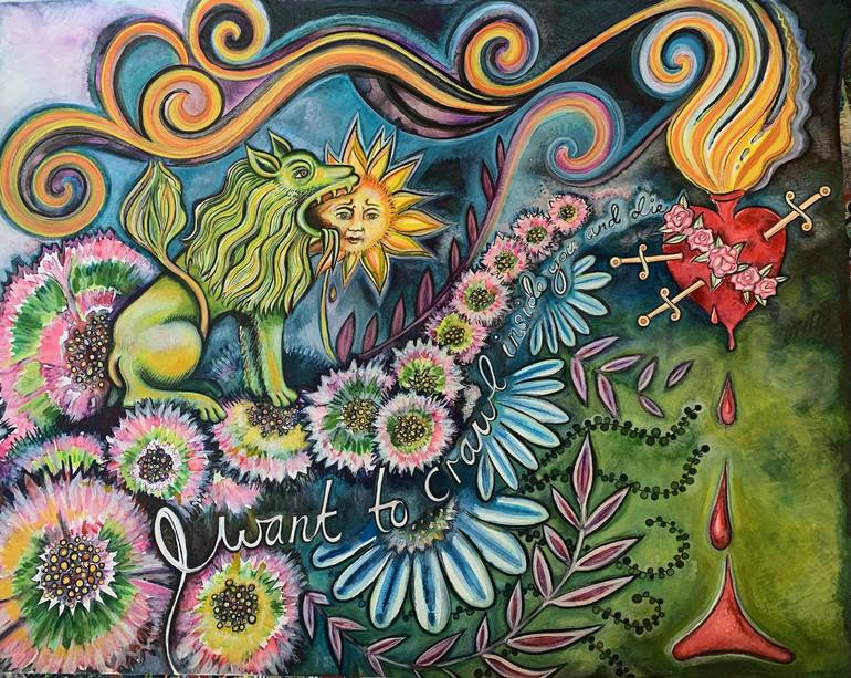 Painting titled 'Bleeding Heart' featuring the text ‘I want to crawl inside you and die’…A melodramatic and slightly ridiculous declaration of intense all-consuming love. I grew up in an Irish Catholic family consequently the rich ornate iconography and symbolism in religious art is a major influe...