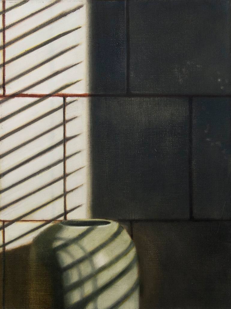 It is a study of a still life. The vase is lit with warm light, and the shadows of the blinds are visible on the background and on the vase. The whole is kept in green and gray. It is an elegant, minimalist and sophisticated painting. It has a quiet, mysterious, but also warm atmosphere. Painting...