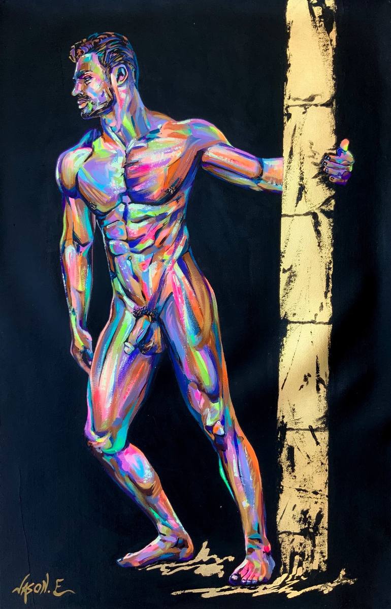 A lovely NEW painting of a muscular gay man in the nude. The painting is oil and acrylic on canvas with gold leaf. The colours are gorgeous and striking and really pops out given the backdrop is entirely in black colour. A really hot piece!