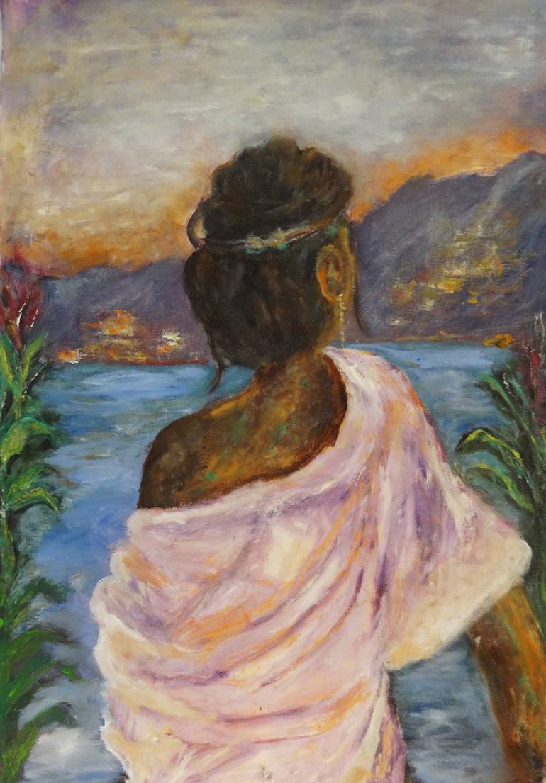 This captivating oil painting portrays a tranquil and introspective scene as a woman gazes out at a stunning morning vista from her balcony. With her back to the audience, she radiates a sense of serene solitude and quiet appreciation for the beauty surrounding her. Clad in an elegant, flowing laven...