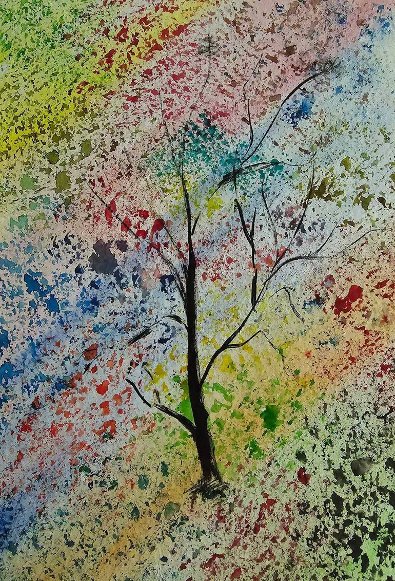 Title: Bloom in Silence In "Bloom in Silence," I wanted to explore the quiet resilience of nature amidst a backdrop of vibrant chaos. The lone tree, with its stark black branches, stands as a symbol of strength, simplicity, and solitude, thriving despite the whirlwind of color around it. The colors...