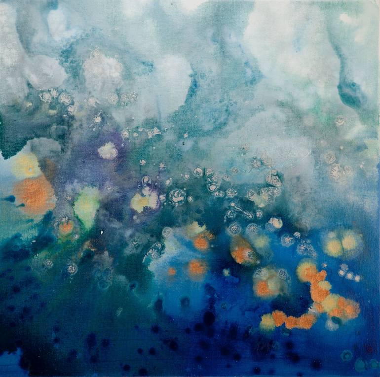 Bloom is an original painting, created with acrylic paint on gallery-wrapped canvas. It has a width of 20 inches and a height of 20 inches with a depth of 1.5 inches (20x20x1.5). The colors used in the painting are white, blue, teal, purple, silver, gold, and copper, and the edges of the canvas ha...