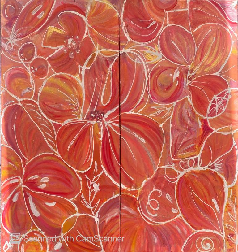 Each canvas measures 48 x 99cm individually. With this piece I wanted to exaggerate further the energy of self which I aim to showcase through my motif by focusing on petals. I used metallic paint to emphasize the colors used, showcasing an energetic effect as the piece can slightly reflect light ...