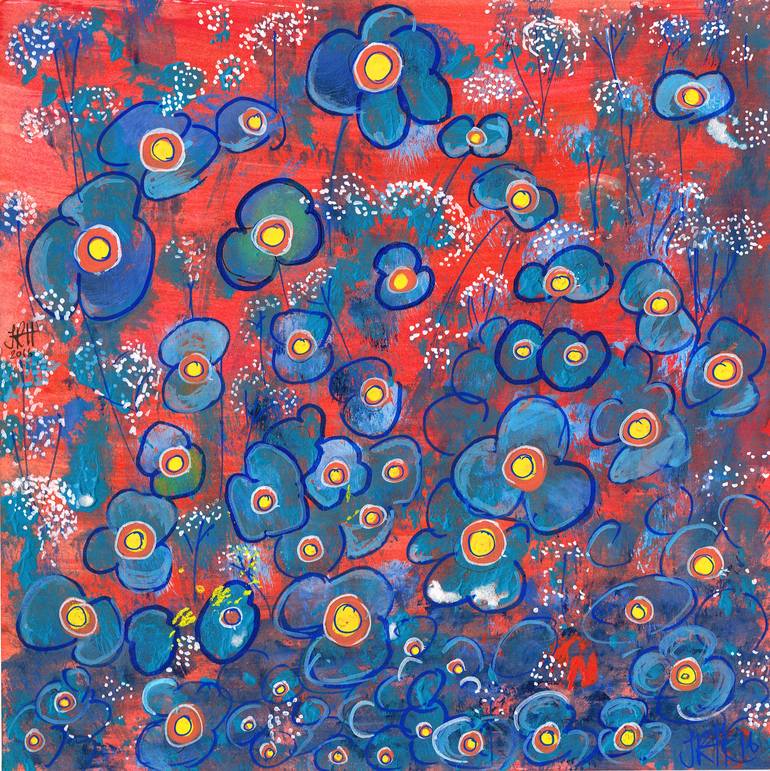 Painting by contemporary British artist Jacqueline Hammond. Acrylic painting on paper framed with white box frame. Modern design feel to this illustrative style painting. Blue flowers on a red background. Design print decorative motif.