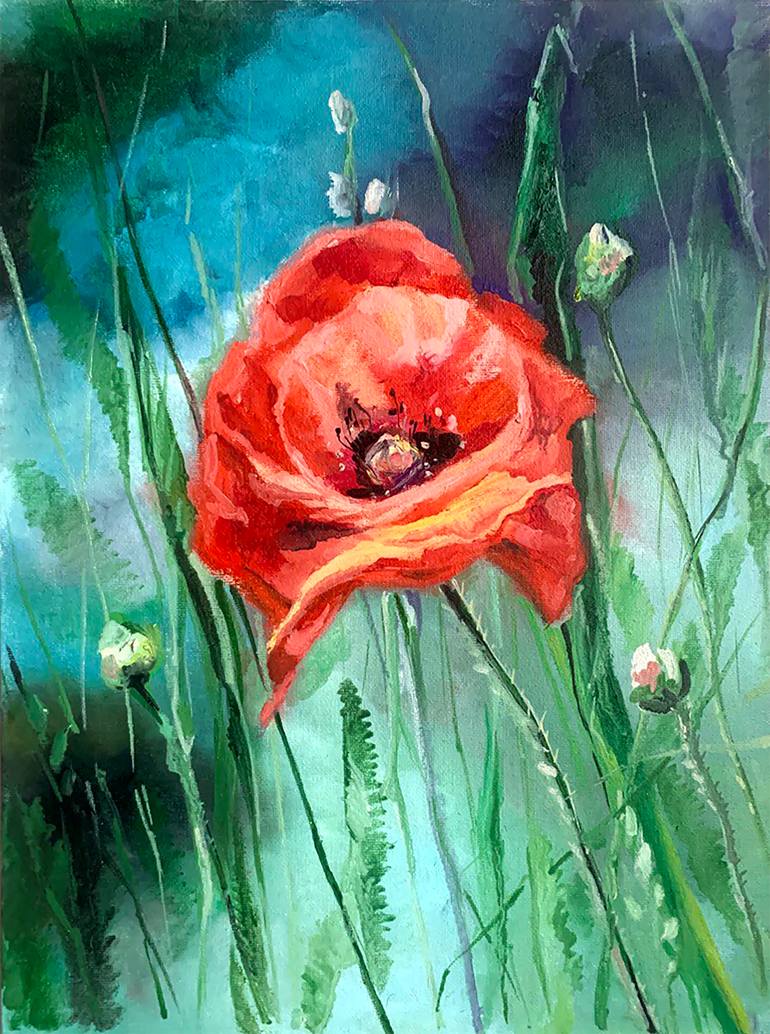 Oil. Canvas on cardboard. This oil painting on canvas captures the delicate elegance of a blooming poppy standing proudly in a vast field. The vibrant red petals contrast beautifully with the lush greenery, creating a sense of harmony and natural splendor. The artwork embodies the fleeting yet mesme...