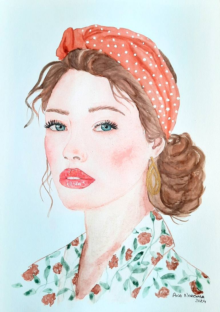 "Blooming Scarlet" is a delicate and expressive original watercolor portrait, capturing a sense of timeless elegance and nostalgia. This artwork features a young woman with a serene gaze, adorned with a vibrant red polka-dot headband and intricate floral patterns on her garment. Painted with meticu...