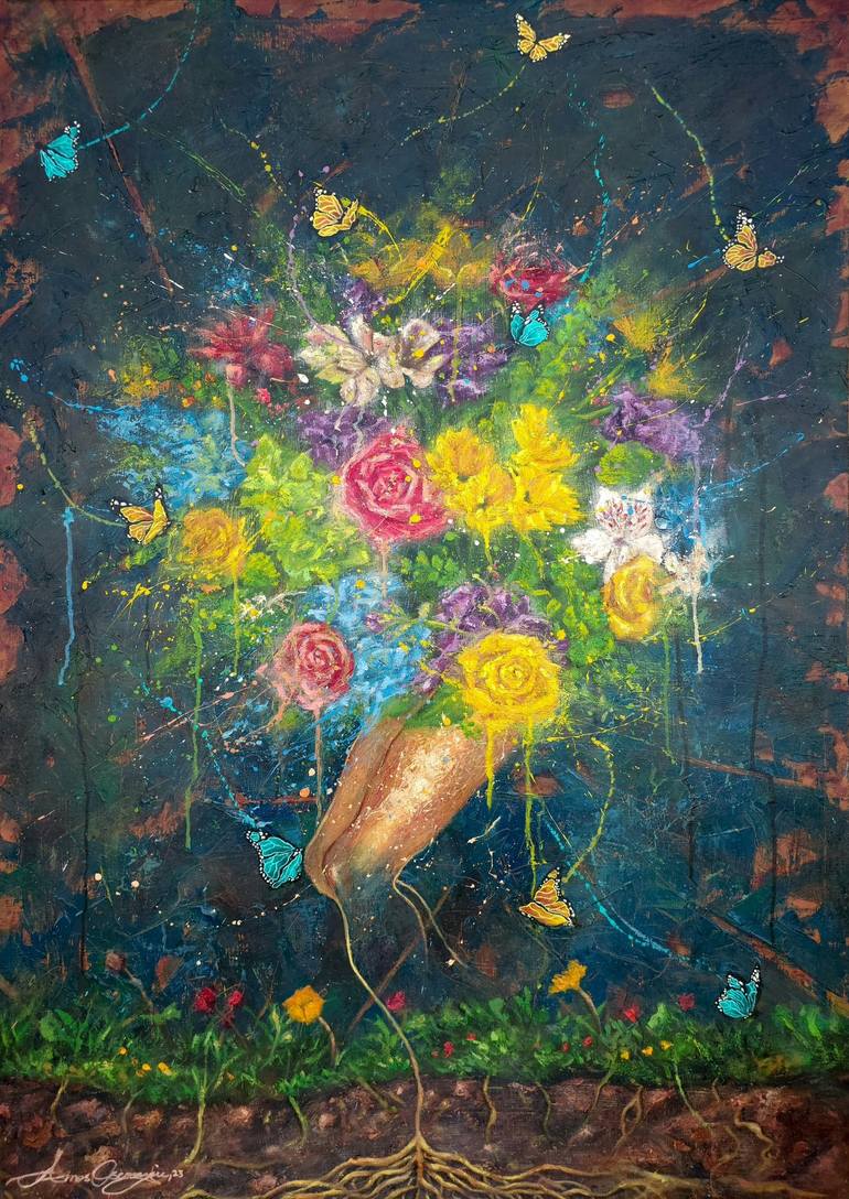 With a very traditional, multilayered approach to painting, Amos Osemwengie creates pieces which embodies the essence of being human while fulfilling his undying love for his practice. Using oils as his primary medium, The self-taught artist who hails from Nigeria, captures his melanated figures with intricate textures that exudes rawness, life and vitality. His figures are painted to feel as though they are breathing and his flowers/leaves are painted to feel as though they are dancing. The artist draws great inspiration from every aspects of nature, the resilience of the human spirit, the things that have stood the test of time, and also what connects us intricately between various facets of life. Amos has exhibited in Lagos and has gained a growing list of private collectors from United States, London, Taiwan and Hong kong.