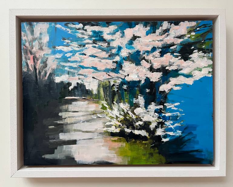 This small oil painting completed in pale natural tones and gentle cerulean blue captures a walk along the towpath of the River Thames. This location features regularly in my work. These beautiful blossom trees line the riverwalk and in Spring they provide a serene and relaxing place to walk. It i...