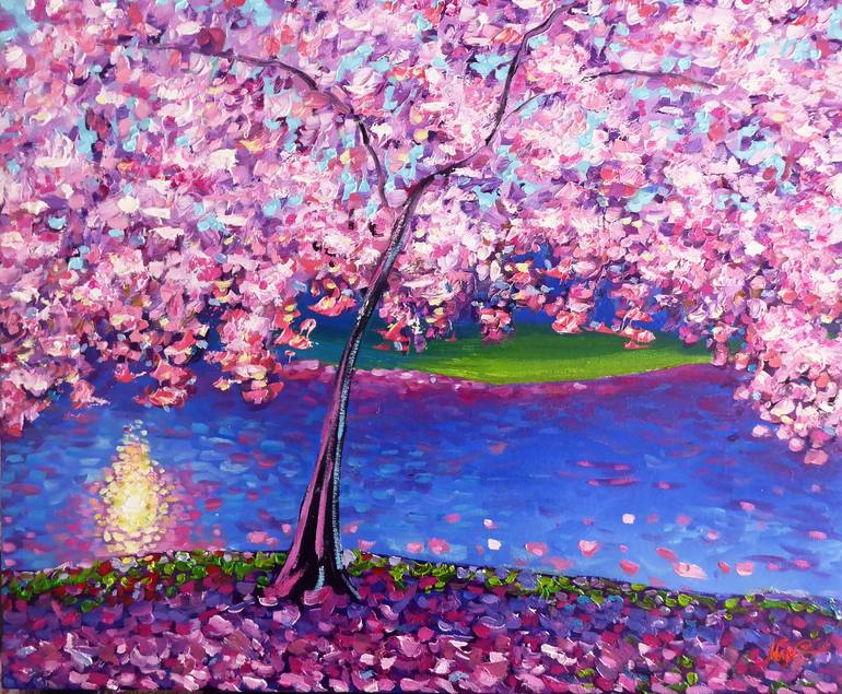 An original art piece by Narek titled "Blossom and Moon" Pink tree. This rare art piece will not be reproduced or copied. Narek completed this painting on 2024 using oil paint on canvas. The dimensions of the painting measures 54 cm (height) by 65 cm (width) by 2 cm (depth). The painting weighs ap...