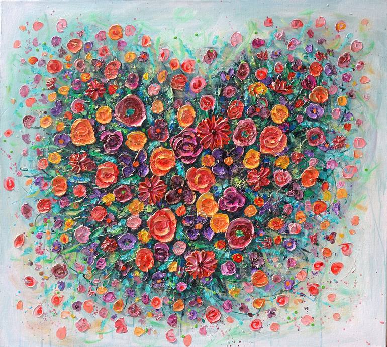 Original impasto painting of flowers. Expressive textured painting on canvas and ready to hang from box to wall. Full of thick paint! Large Floral art SIZE: 40" wide x 36" High (100x91cm) MEDIUM: High-quality professional acrylic paints and mediums. Varnished for protection and longevity. SURFACE...