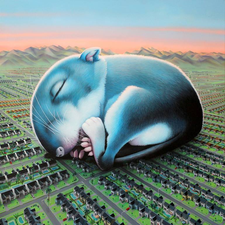 Soon everyone will get up, say hello to their neighbors, go to work and then go home and start all over again tomorrow. This gigantic baby mouse sleeping peacefully does not seem to interfere with the apparent tranquility of this suburban town still asleep on a hot summer morning.