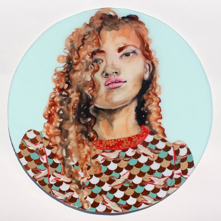18-inch diameter, round painting. Ink, watercolor, acrylic, and paper collage on paper, covered in resin, mounted on a round panel. Comes ready to hang, no extra framing needed.