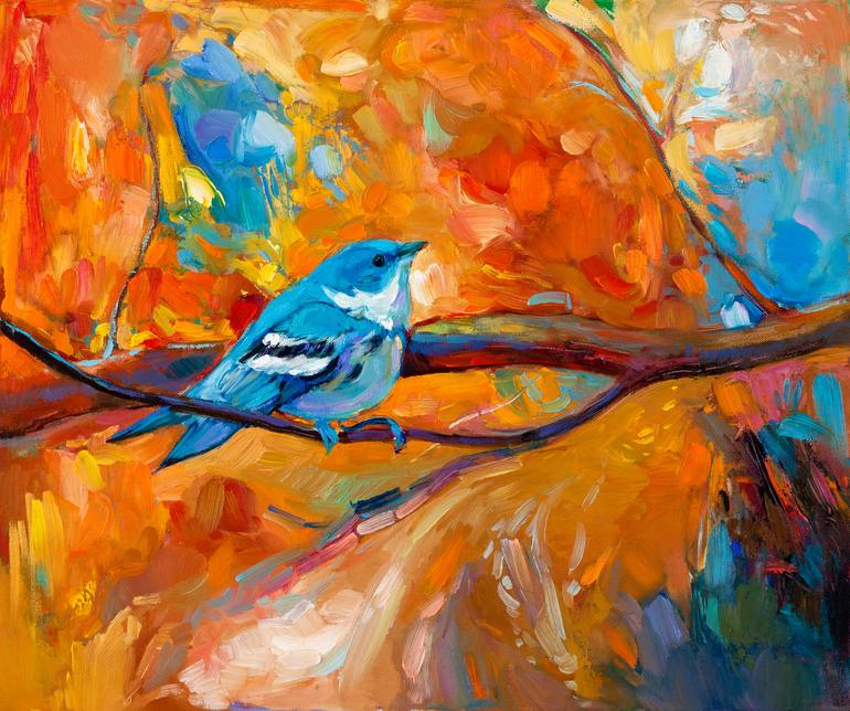 Original oil painting of blue Cerulean Warbler song bird on canvas.Modern impressionism