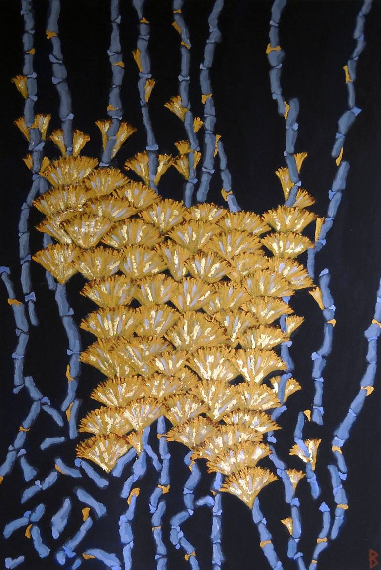 I love the ocean - and corals - this example of blue corals is a bit of a fantasy - but I love the interaction between the dark blue ocean - the lighter blue coral and the "gold" shine of the "flowers" - I have used gold foil to create the shimmer and acrylic gold paint. This painting might remind y...