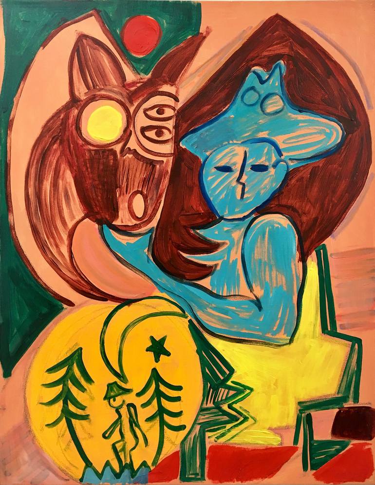 I employ bright colors and shapes with acrylics that immediately grab the eye. My work is a bold and memorable display with colors used in signage to noticeably capture an otherwise forgotten moment. The loud colors represent femininity, courage and strength in a modern world. Perhaps related to not wanting to let go of a memory and the desire to be remembered. I am inspired by the vibrant colors and patterns of folk art and crafts. Although color takes precedence in these paintings. Shape interaction and patterns play an important role. They are like rhymes that harmoniously flow through my compositions. My images are dreamy fantasies transforming the subconscious to another place I also think about the autonomous drawings of the surrealist or drawing without conscious thought. Regardless of the common domestic plots there is nothing completely ordinary in my world of painting. They bravely incorporate a carefree style. One moment of creation may not necessarily be safely carried to the next painting. My work has a range of figures, symbols, patterns that switch from recognizable to abstraction. This arrangement exudes a surreal dreamlike quality. The paintings weave in and out of my dreams. They dive into the mind and bounce out to bold world of art. Fantasy transforming into materiality. Ultimately I like to think of how my artwork and femininity takes place in the modern world. I channel memories, ancient wisdom and dreams of women from the past. My patterns and electric colors with dynamic shape interaction bring a new femininity, boldness and bravery, as we face the uncertain future.