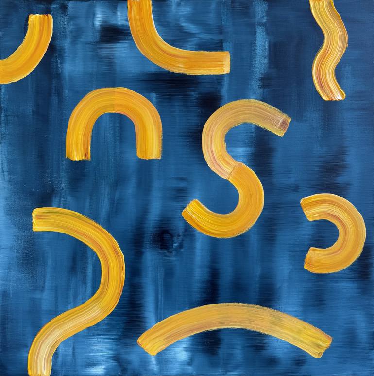 Enhance your space with a Memphis-style abstract painting, a bold and expressive acrylic artwork. Part of a four-piece collection, it features curving golden-yellow forms set against a rich, deep blue background with subtle tonal variations. The warm contrast of yellow and orange hues against the co...