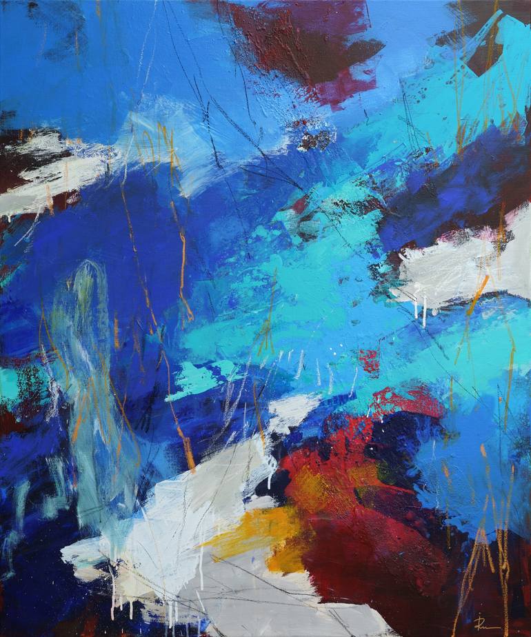 Materials: Stretched canvas, Acrylic and Oil Pastel Sides: Painted as a continuation of the motif Frame: Unframed, further framing possible but not necessary. Varnish: Silky finish with UV protection Signature: Front and verso, also signed Certificate of Authenticity The work will be shipped stretch...