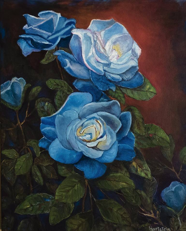 i wanted this painting to capture a moment of stillness and beauty, where blue roses bloom in a tranquil garden. The artist has created a garden filled with blue roses that seem to glow with an inner light. The painting is rich with detail, from the intricate patterns on the petals to the delicate ...