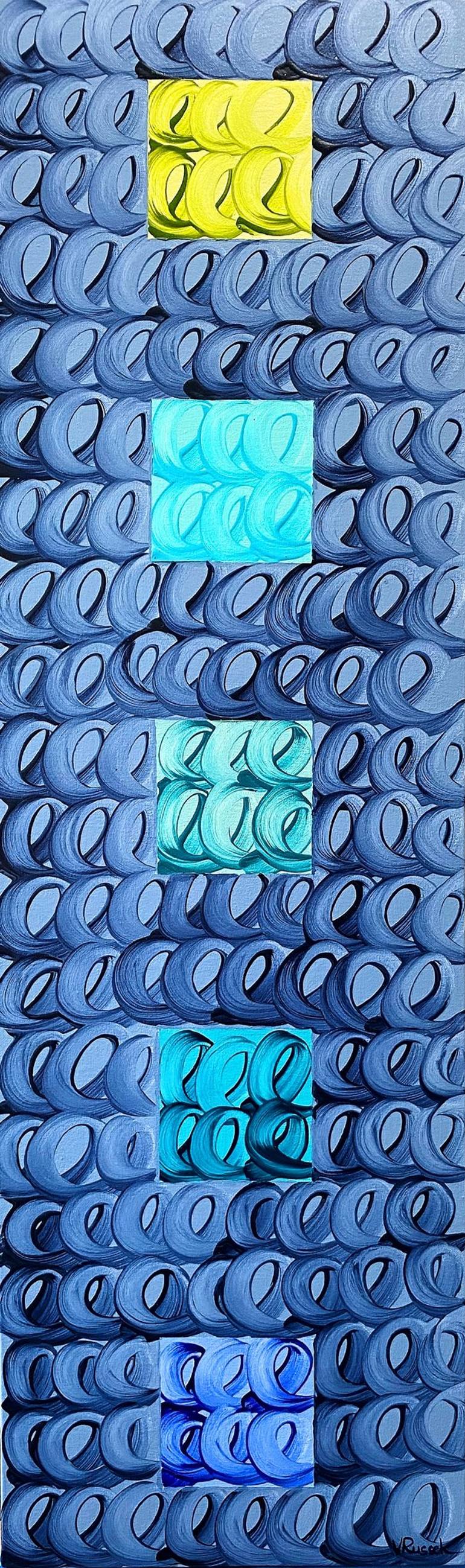 Painting done in a narrow vertical canvas, depicting a color gradation from green to blue, with squares, done in protocalligraphy swirls, characteristic of the artist. The swirls are done with force and intention. They give the piece visual texture and movement, the color palette is soothing and c...