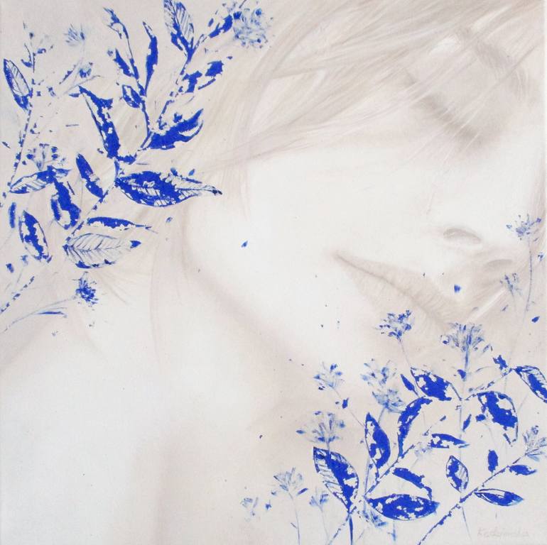 The painting shows a woman who blends in with cobalt blue plants. The idea was to combine woman beauty with nature in shades of pure blue. Inspiration was the work of the artist Yves Klein. The image is filled with harmony and peace. Mood is mysterious and ephemeral. I use high quality, profession...
