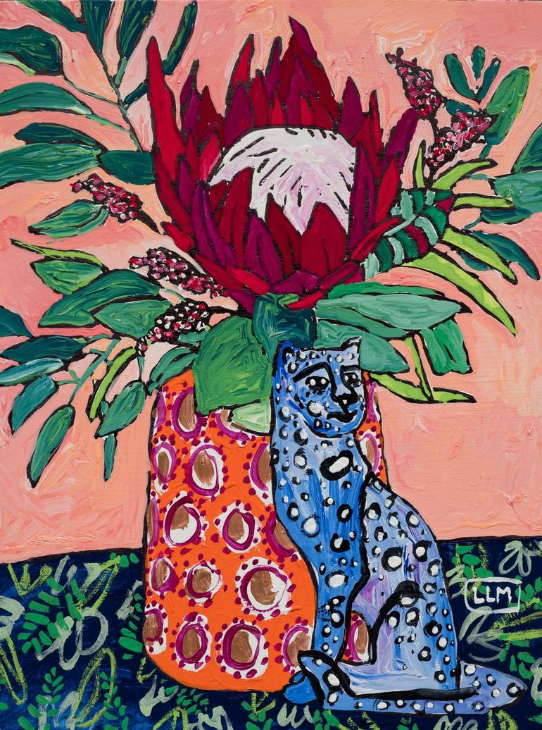 A small original painting on cradled board in the most delightful soft blush pink, this piece features a bouquet of leaves and berries and blooms including a deeply red and purple king protea. It was painted using acrylic gouache so it has a deliciously velvety matte surface with lovely visible pain...