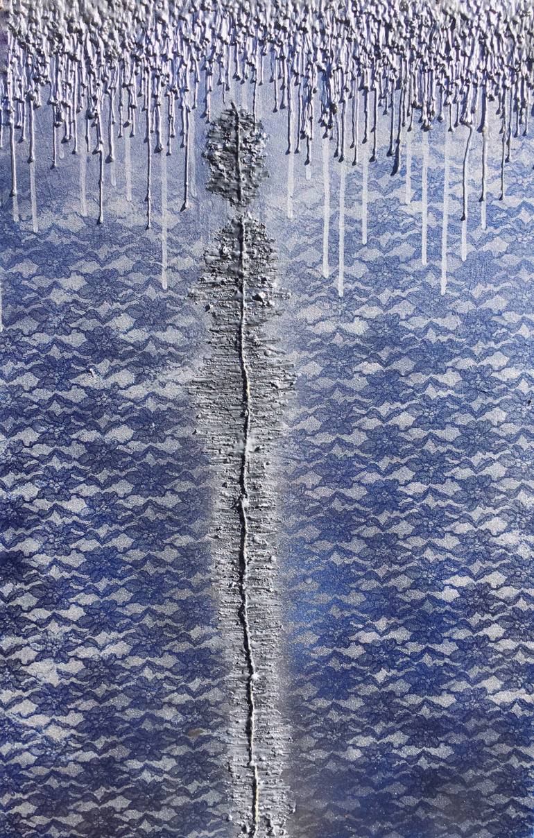 I chose the lace for its fragility and vulnerability. The textured paint for its contrast and the candle wax to represent the strength in transformation. It is said that the color blue denotes peace and tranquility, that is a giving color. I created this piece during a moment of extreme gratitude wa...
