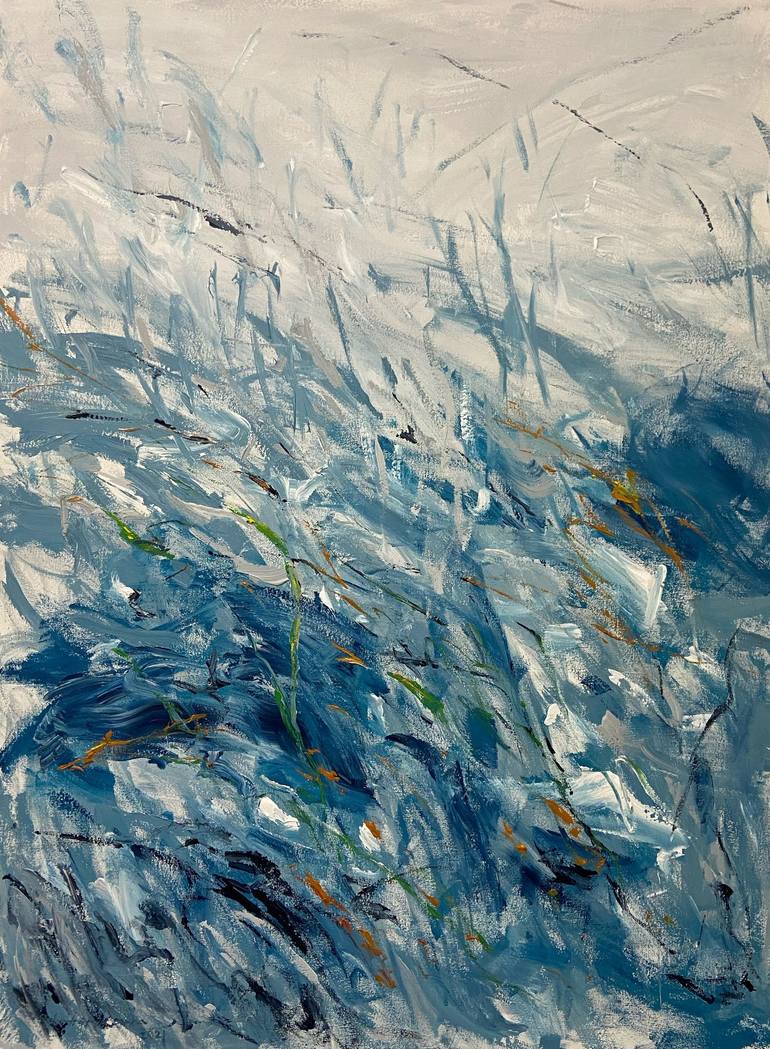 Acrylic, gesso, china marker on canvas. Abstract landscapes, memory places, Spring, mountains, flowers. This painting is one of my new large un-stretched canvas series, it shows more freedom on brush strokes, and spontaneous paint marks. The studio painting process can be seen all the way to the sid...