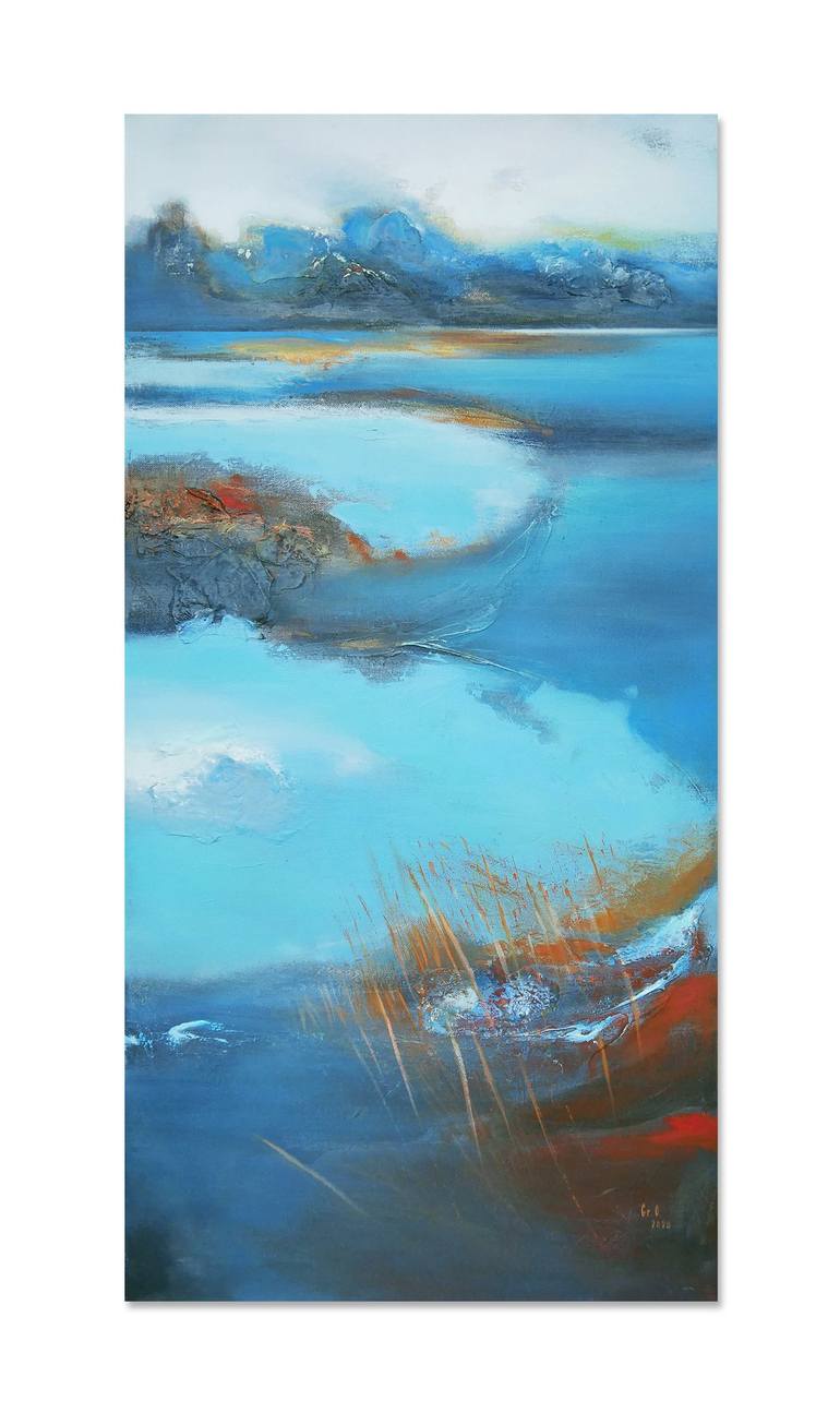 Blue Landscape. I used an acrylic and gesso on a 100% cotton fine-grained canvas panel. Lenth: 50 cm (19,7 in) Height: 100 cm (39,4 in) Width: 3,5 cm (1,4 in) Painted on a back wrapped stretched canvas, ready to hang. The work is signed. Edges are painted in continuity with the painting. Covered wi...