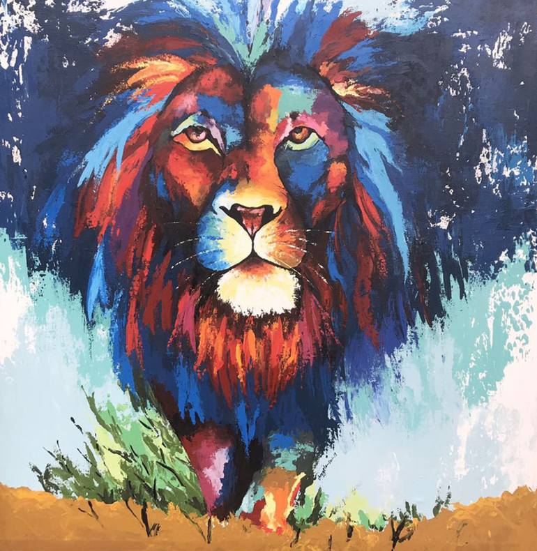 Capturing the sheer power and raw strength of the male lion. Painting in acrylic with palette and brush.