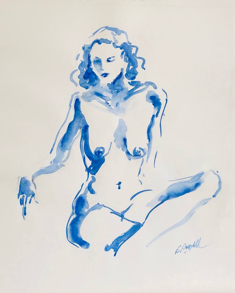 Blue Nude II was painted from a. live model session. It was first sketched in conte, then watercolor to define her shape and add dimension. I like to keep my figurative work modern and clean, leaving white space and keeping the strokes loose and expressionist, while maintaining the lightness and tra...