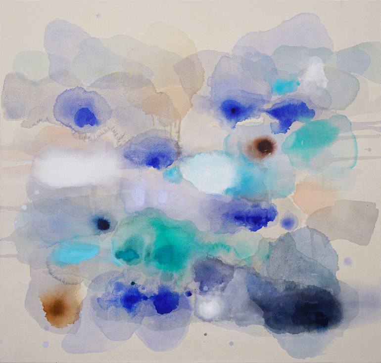 This piece is an abstract work inspired by the colors of a refreshing tropical ocean and the sparkling sensation of its waves, featuring a harmonious structure of these colors in a cohesive composition. The layered, diffused colors naturally develop on the raw canvas, allowing the viewer to feel the...