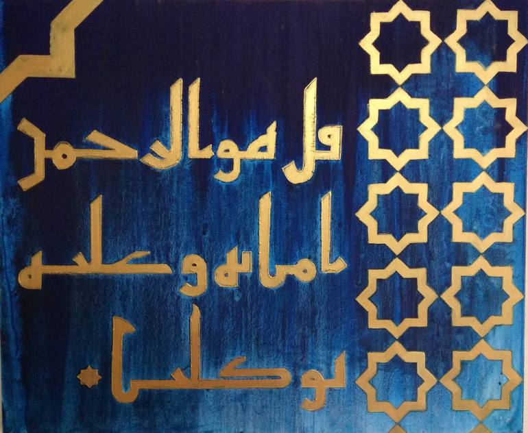 AL-MULK (67:29) Say, "He is the Most Merciful; we have believed in Him, and upon Him we have relied. The artwork combines extract from Blue Quran and a dominated geometric pattern of Islamic architecture. The manuscript Blue Quran is a famous art piece of Islamic history (9th century) having gi...