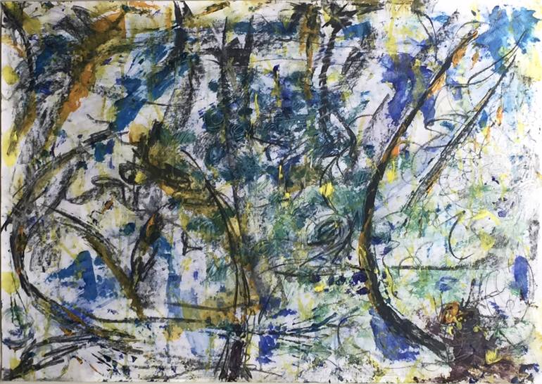 The inspiration came from music and movement which brought up the feeling of blue as beams of energy in a mass of highly charged movement. Each change of tempo, change of musical instrument brought a change of colour or medium of expression. It was a very joyful energetic creation and brought me mu...