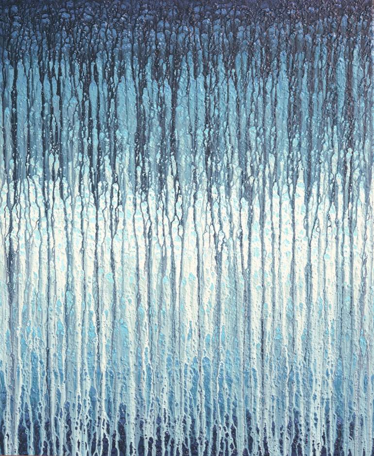 Blue River Rhythm is a meditation on movement, nature, and the spaces that exist beyond the visible. I used a heavily textured canvas to guide the fluid motion of acrylic paint, allowing it to flow in organic, vertical streams. This technique helps me evoke the sensation of water — maybe rain on gla...