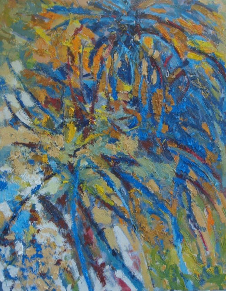This is a summer painting. I have tried to convey a feeling of colour and heat in the garden. I also looked for the structure and movement in an area full of plants.